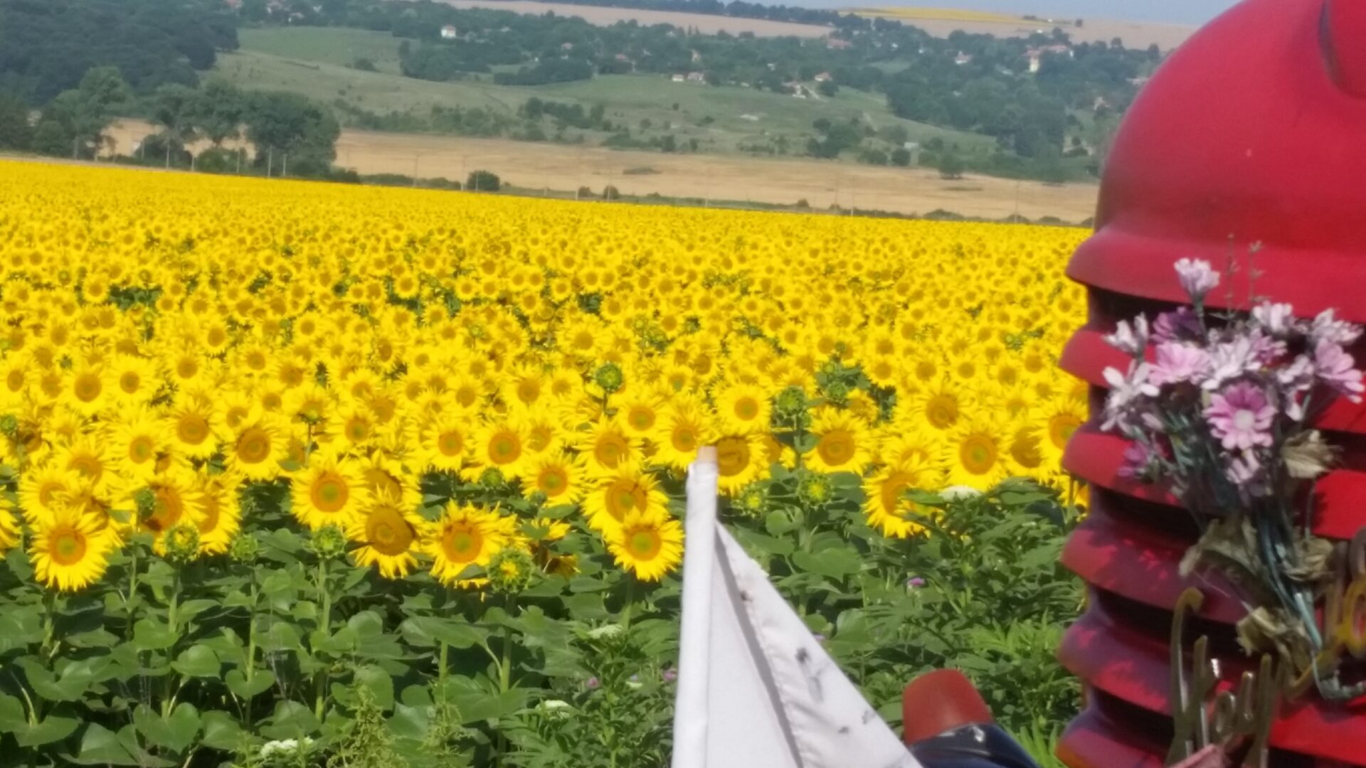 Die Sonnenblumenfelder sind hier in Bulgarien in voller Blüte. In Rumänien sind sie noch weiter hinten mit der Blüte.