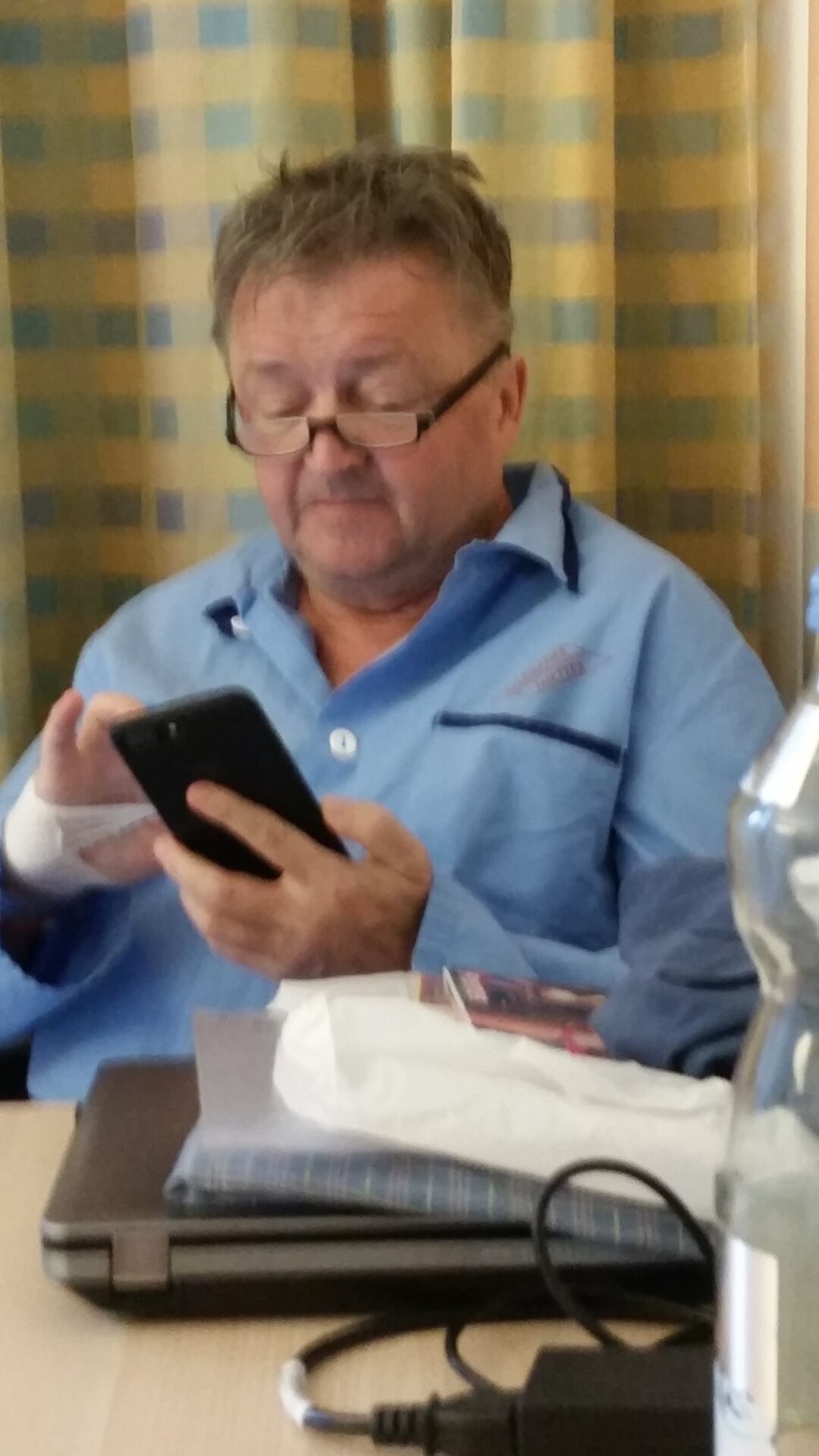 In der Rezeption fragte ich nach wo er sein Zimmer hat. Und die Frau sagte, daß sie den Patienten zuerst fragen muß, das ist das neueste Gesetz. Er kam sofort herunter vom Zimmer und machte mir einen guten Eindruck. Wir machten Witze und ich erzählte ihm einige Geschichten von der Reise.