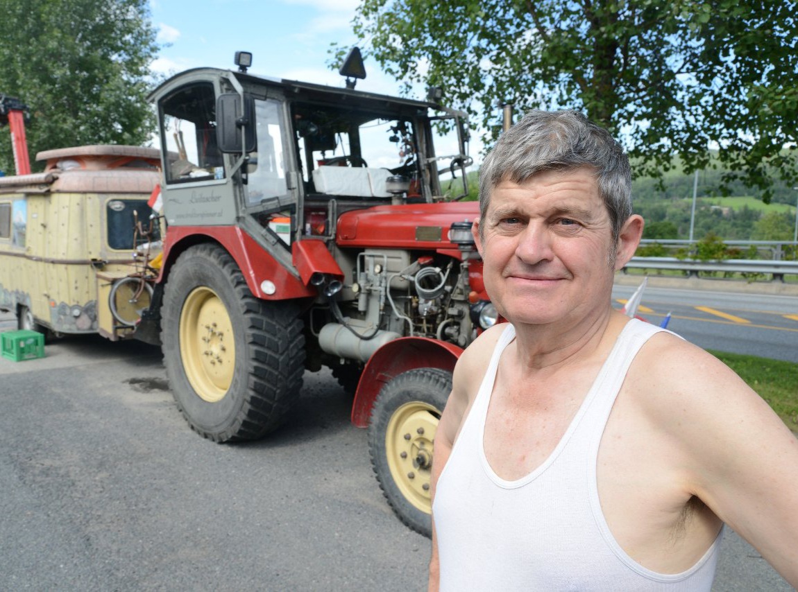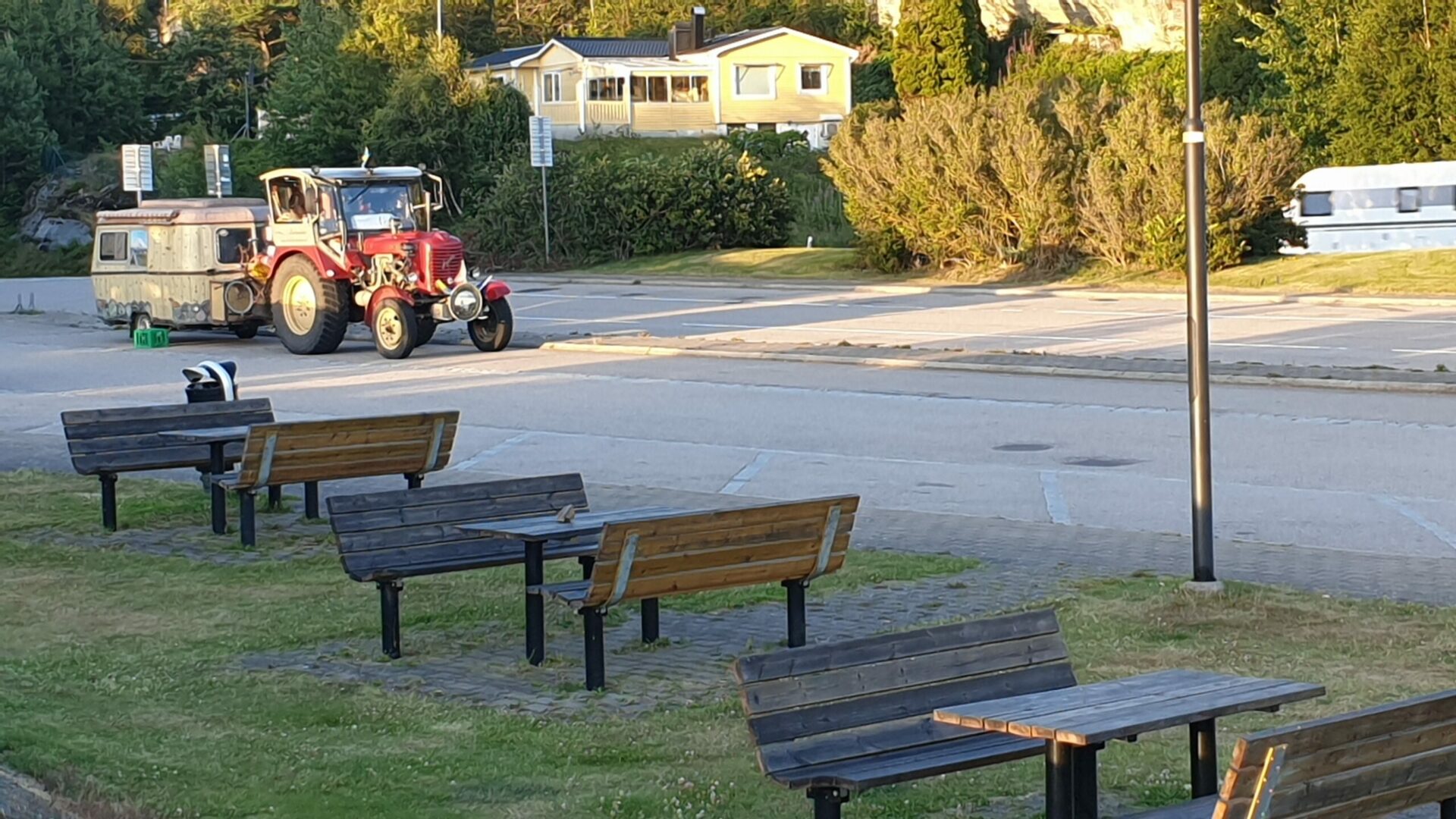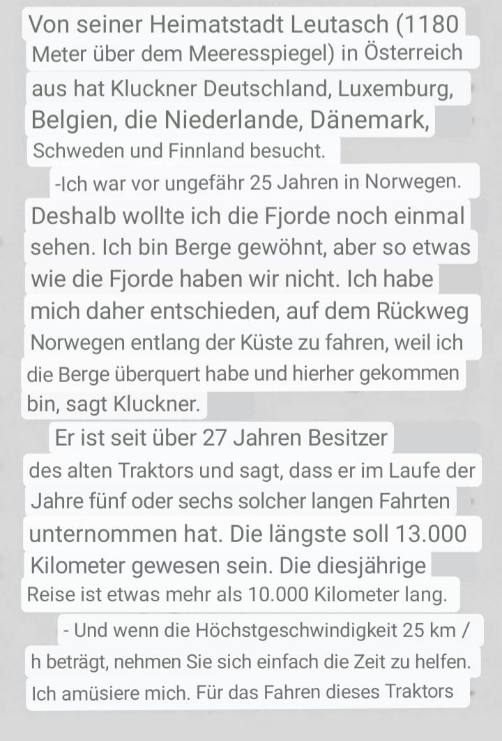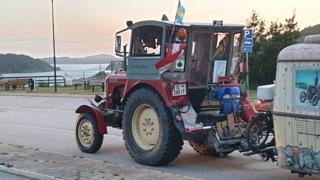 Nach 6 wöchiger Norwegenreise im Wohnmobil , vor mir ein Wohnwagen mit österreichischem Kennzeichen. Beim Näherkommen traue ich meinen Augen nicht , er wird von einem Traktor, rot weiß rot beflaggt, gezogen!