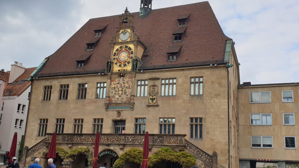 Das Rathaus : gehört zu den Warzeichen der Stadt Heilbronn, das zwischen 1950 und 1953 nach historischen Vorbild wiederaufgebaut wurde. Der repräsentative Bau wurde 1417 im gotischen Stil errichtet.