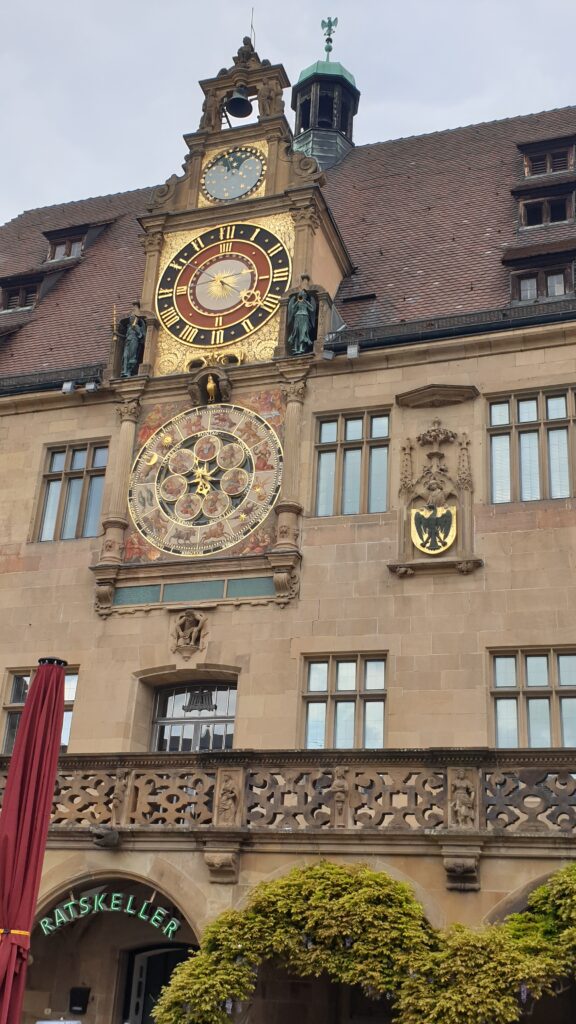 Prunkstück der Rathausfassade ist die 1579/80 endstandene Kunstuhr mit astronomischen Uhr und Mondfasenuhr von Isaak Habicht.