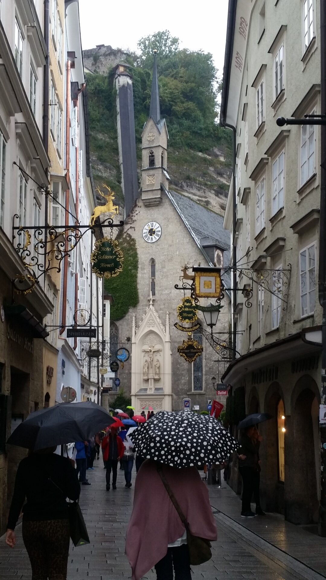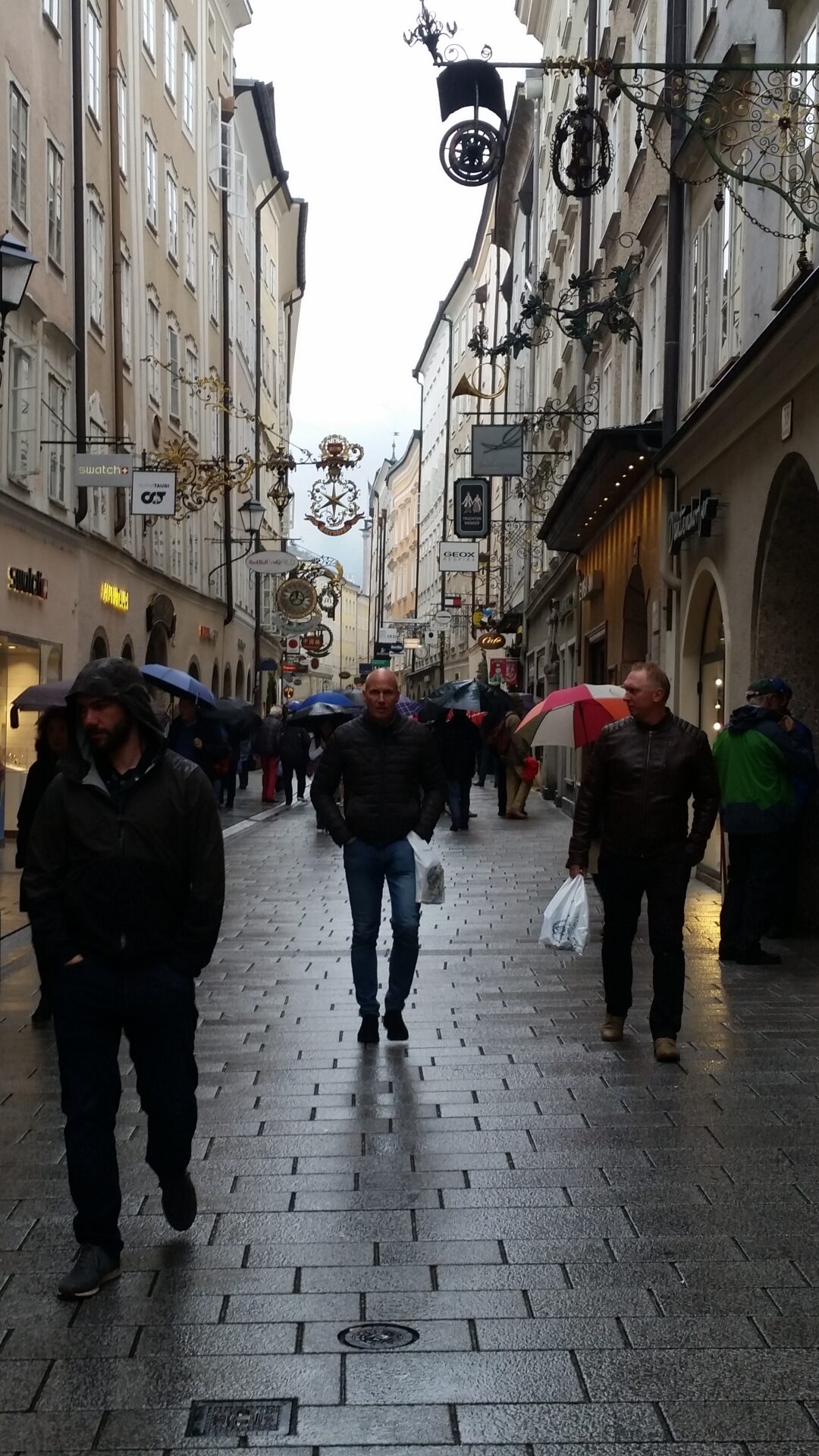 Dann suchte ich mir einen Parkplatz und ich folgte einem Parkplatzschild, dann stand ich plötzlich vor einer Parkgarage mit der maximalen Höhe von 2.2 Meter in einer Einbahnstraße. Der Traktor hat 2.8 Meter. Zu meinem Glück konnte ich rückwärz quer in einen Seitenabstellplatz fahren, wo ich dann auch stehengeblieben bin. Ich ging dann zufuß in die Altstadt direkt in die Getreidegasse. Das ist die bekannteste Gasse in Salzburg. Heute ging es zu wie in einem “ Taubenschlag „trotz Regen.