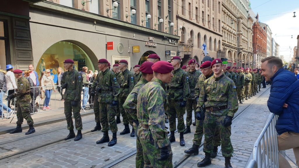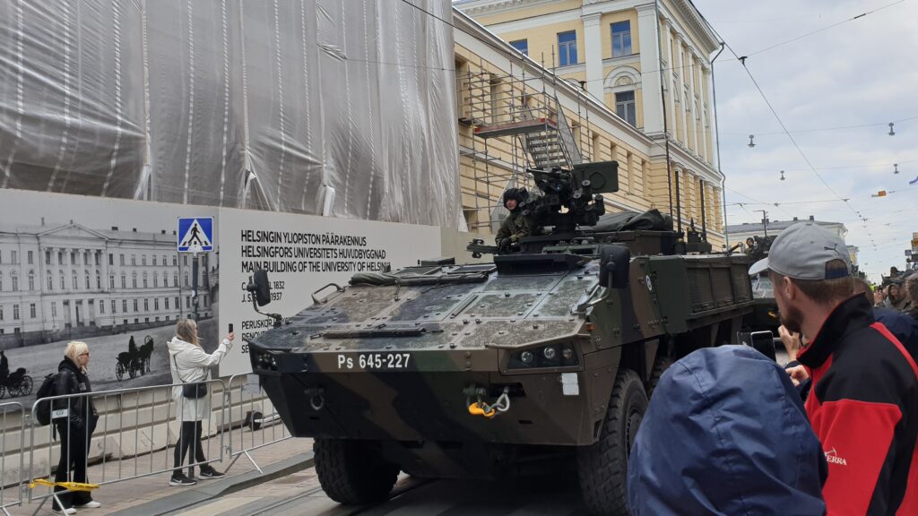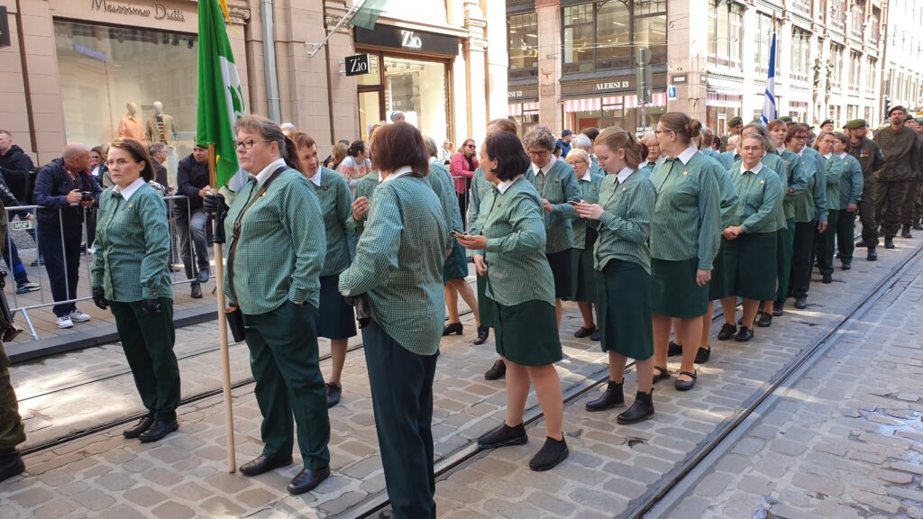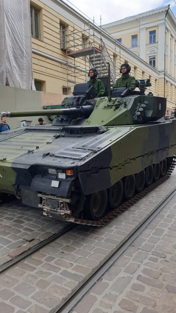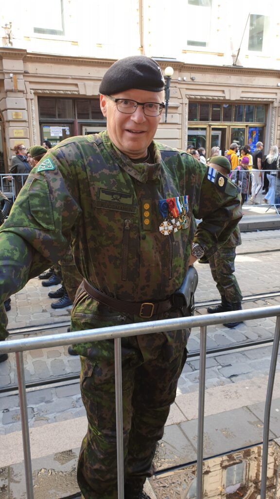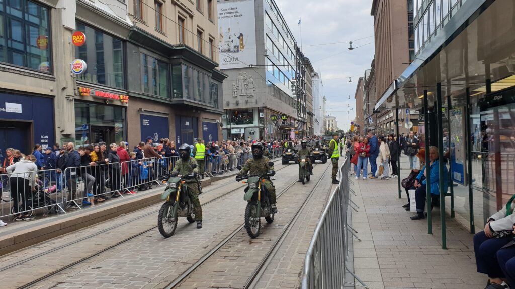 Nachdem ich 1,5 km zum Stadtzentrun ging, sah ich von weitem eine „morzialischen“ Menschenauflauf. Als ich näher kam, war das eine Millitärparade, die eine Machttemonstration zur Schau stellt. Das ist jedes Jahr in einer anderen Stadt. Die Finnen sind sehr stolz auf ihr Millitär selbst die hochdekurierte Veteranen bis zu den Kantinenschwestern sind mit freude dabei.