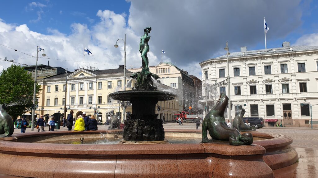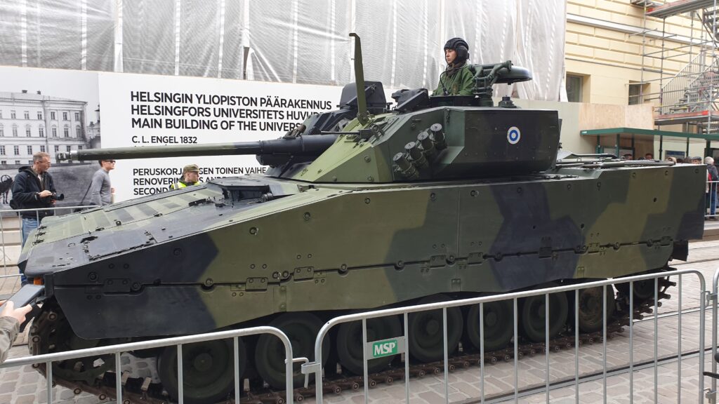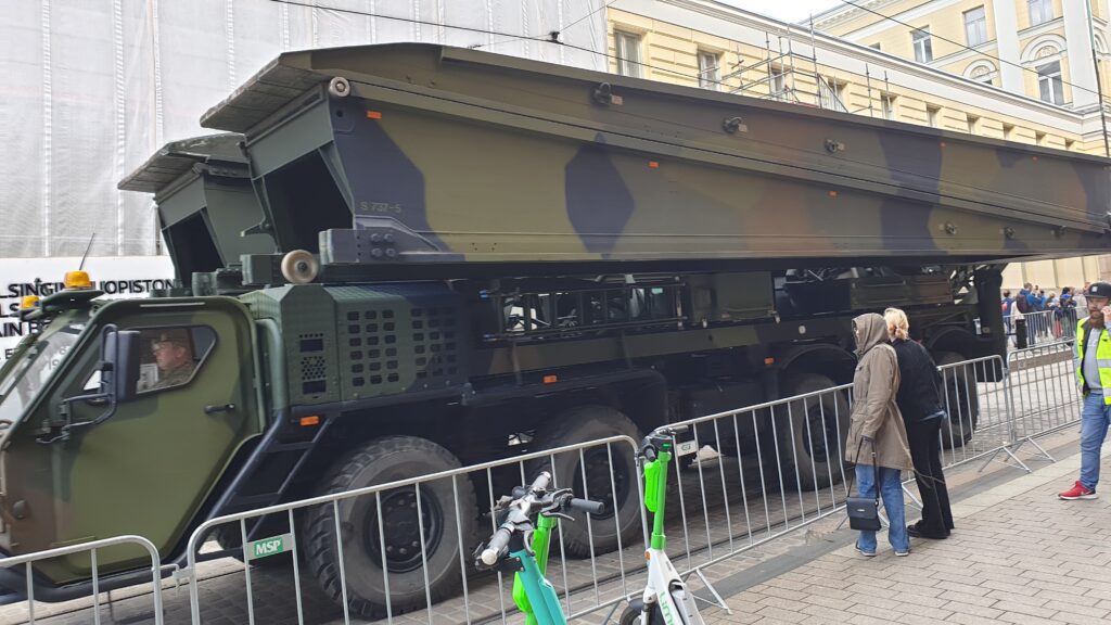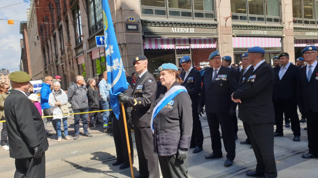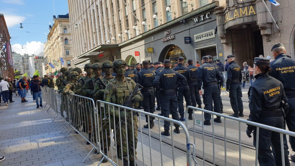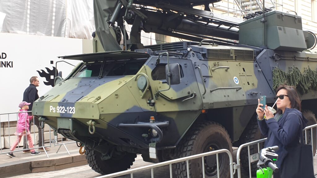 Nachdem ich 1,5 km zum Stadtzentrun ging, sah ich von weitem eine „morzialischen“ Menschenauflauf. Als ich näher kam, war das eine Millitärparade, die eine Machttemonstration zur Schau stellt. Das ist jedes Jahr in einer anderen Stadt. Die Finnen sind sehr stolz auf ihr Millitär selbst die hochdekurierte Veteranen bis zu den Kantinenschwestern sind mit freude dabei.