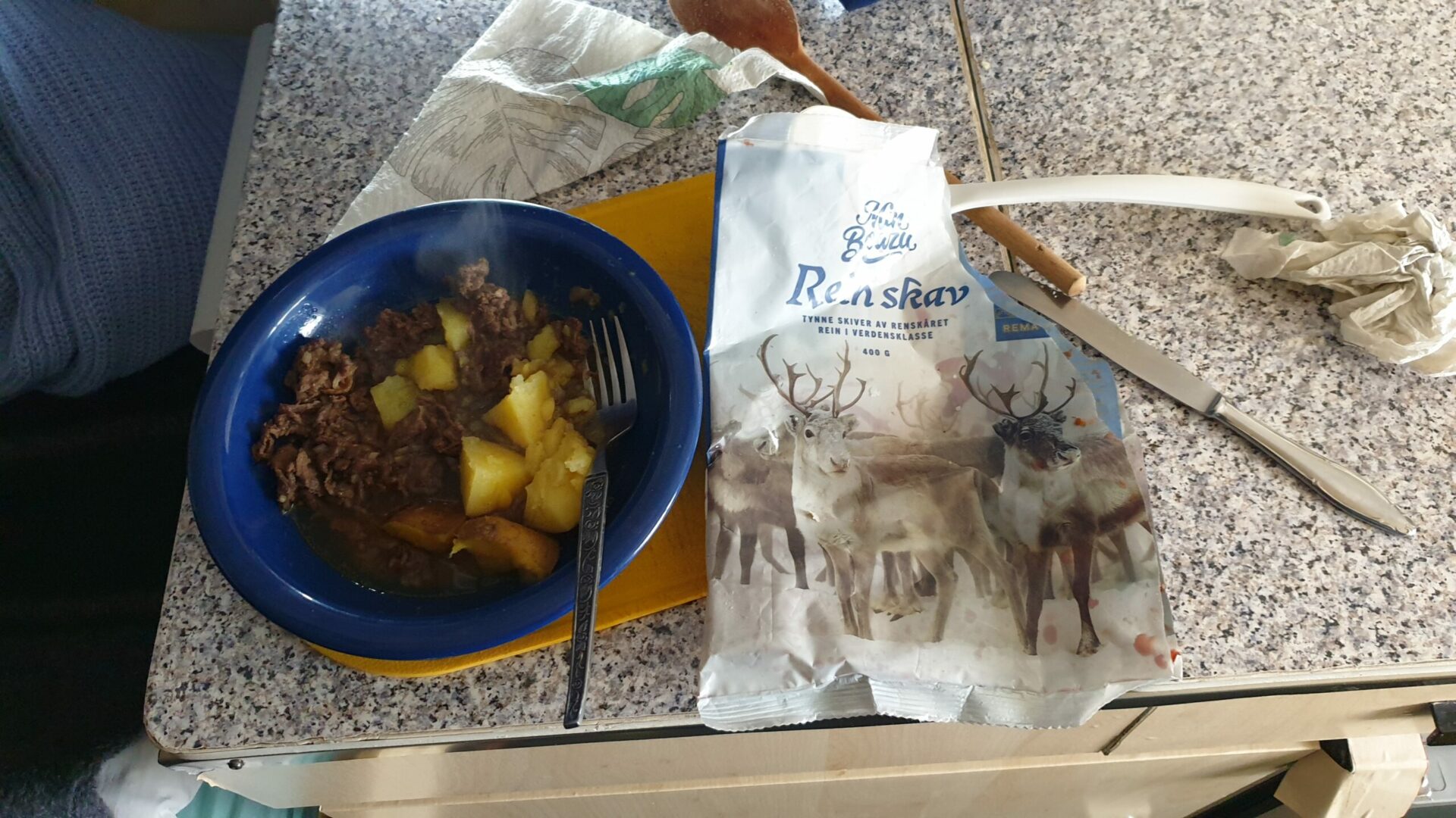 Zum Mittagessen gabs heute Rentierfleisch. Ich mußte das ausprobieren und es schmeckt so zwischen Schaffleisch und Ziegenfleisch 🐏🐐 👍