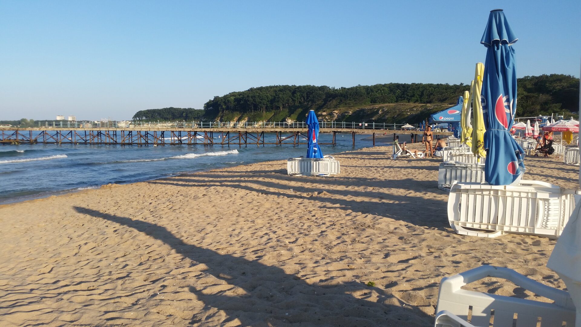 Nach dem Frühstück ging ich zum Strand um herauszufinden wo ich am besten liege. Ich frage auch die Sonnenschirmvermieter was sie pro Tag verlangen. 15 LEW das sind € 7,50- ist mir viel zu viel !! Daraufhin suchte ich mir ein Geschäft und kaufte um 25 LEW einen Sonnenschirm. Damit ging ich dann zum Strand und richtete mir ein schönes Plätzchen.